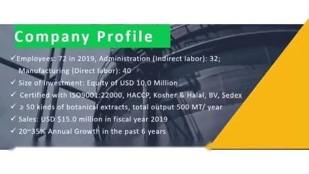 Hunan Sunfull Bio-tech Co., Ltd. یک شرکت با فناوری پیشرفته با بیش از 20 سال تجربه حرفه ای در عصاره های گیاهی طبیعی است. ما در تحقیق و توسعه، تولید و فروش عصاره های ممتاز تخصص داریم، با گواهینامه هایی از جمله ISO9001، ISO22000/HACCP، KOSHER و HALAL.