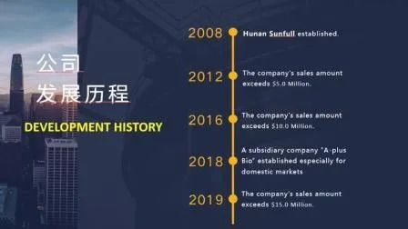 شرکت Hunan Sunfull Bio-tech Co. Ltd.یک شرکت با تکنولوژی بالا با بیش از 20 سال تجربه حرفه ای متخصص در تحقیق و توسعه، تولید و فروش عصاره های گیاهی طبیعی است. این شرکت دارای ISO9001، ISO22000 / HACCP، KOSHER،و گواهینامه های HALAL، و جایزه درجه دوم ملی و جایزه اول استان را دریافت کرده است. مارک های تجاری شناخته شده آنها شامل Sunfullbio ، Sunepica TM و Teavital TM است.
